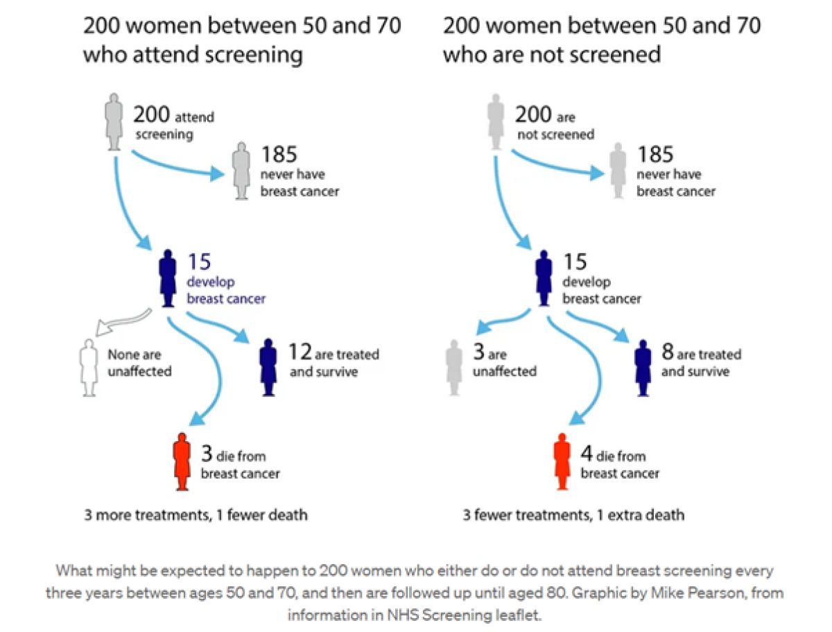 Yn ddiau, mae sgrinio canser y fron yn arbed bywydau ac, yn naturiol, mae’r rhan fwyaf o fenywod yn croesawu’r cyfle i gymryd rhan pan gânt wahoddiad. Fodd bynnag, fel y mae’r diagram isod yn ei ddangos, mae agweddau negyddol ar y rhaglen.
