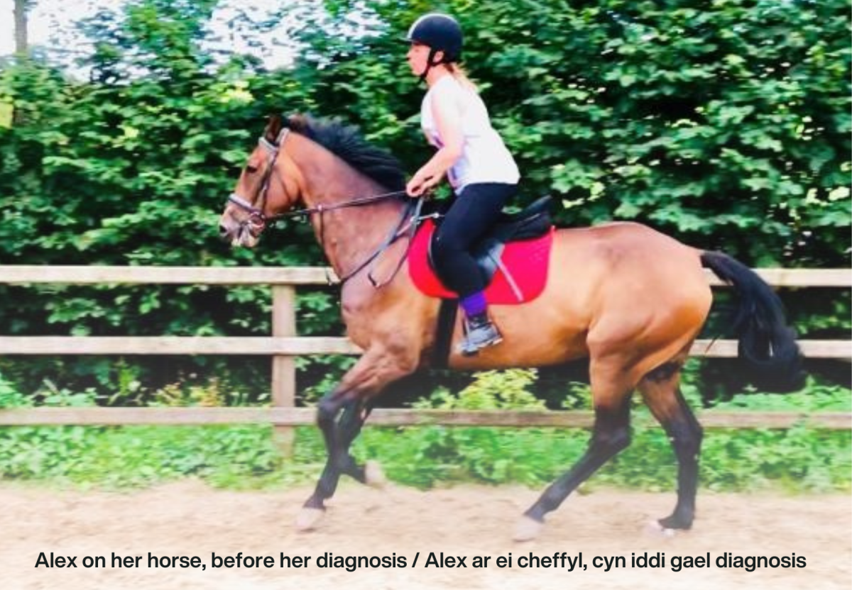 "Heb os, mae fy mhrofiad o ganser wedi fy newid. Mae rhai pethau yr wyf wedi gorfod eu derbyn na allaf eu gwneud mwyach, megis marchogaeth fy ngheffyl. Mae'r canser wedi dwyn fy hyder yn y cyfrwy. Ar ôl i mi ddisgyn o fy ngheffyl, sylweddolais fod yn y frwydr o ran fy angerdd am geffylau, mai canser ennillodd, felly nid wyf yn marchogaeth bellach," meddai Alex.